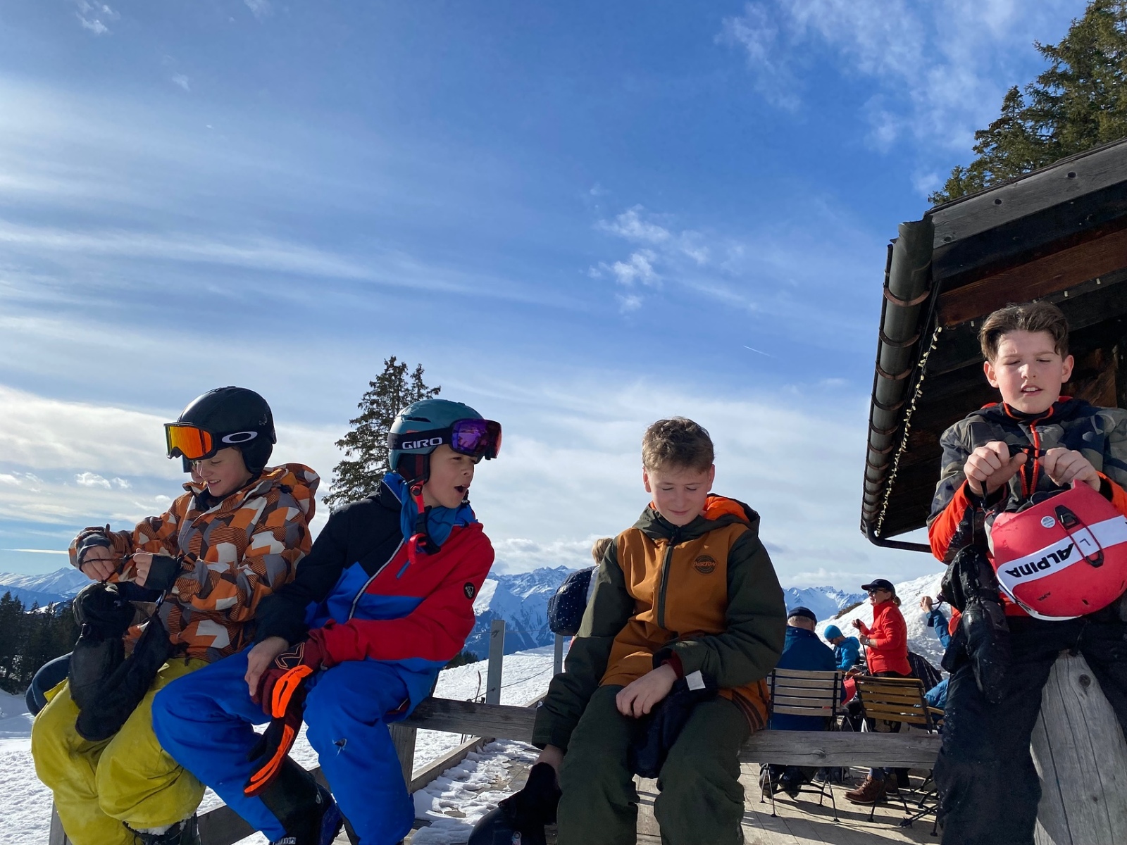 Am Mittwochmorgen sind wir ganz normal und cool aus dem Nebenhaus ins Haupthaus zum Frühstück gegangen. Es gab Brötchen und fast alle möglichen Bestriche. Wir machten uns bereit fürs Skifahren und gingen los auf die Gondeln. In der Gondel sahen wir wunderschönen Sonnenschein und schon waren wir auf dem Berg.