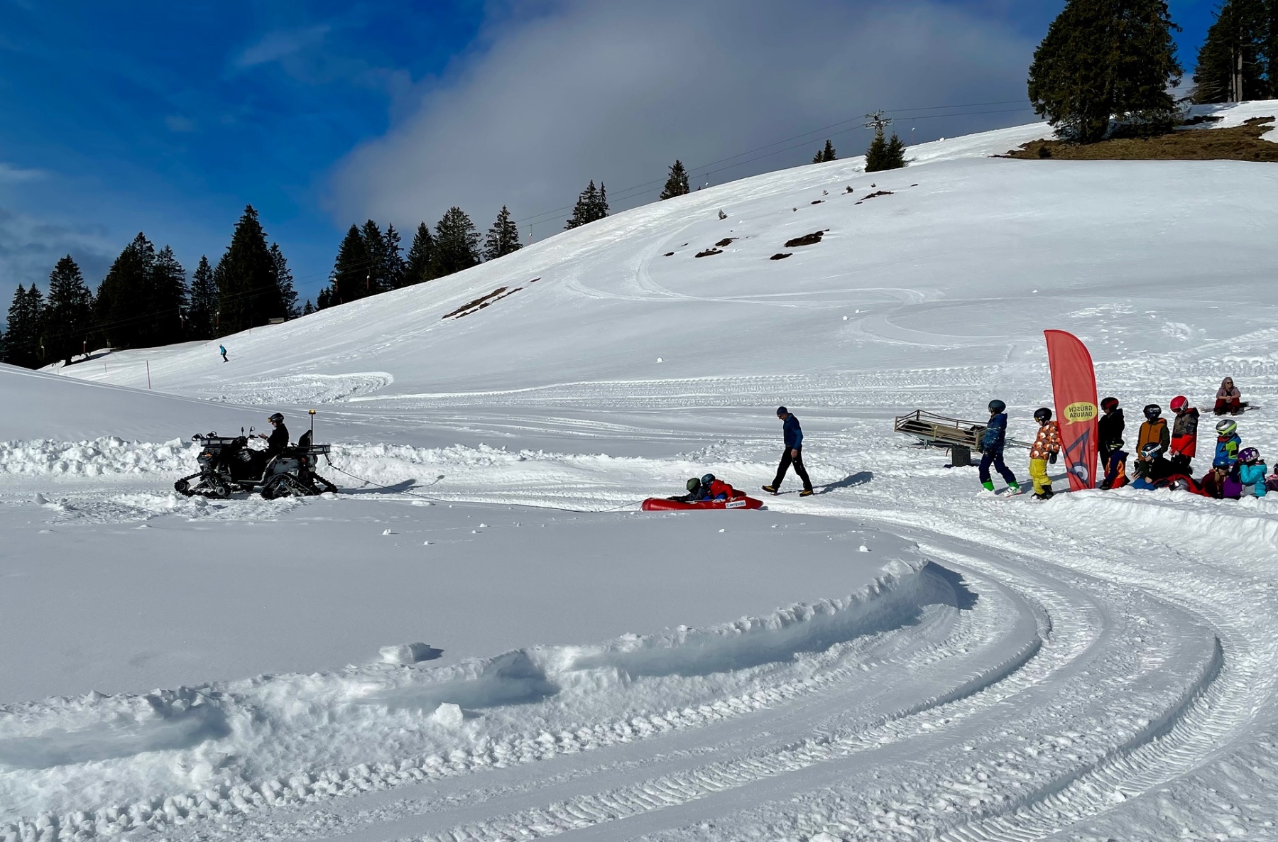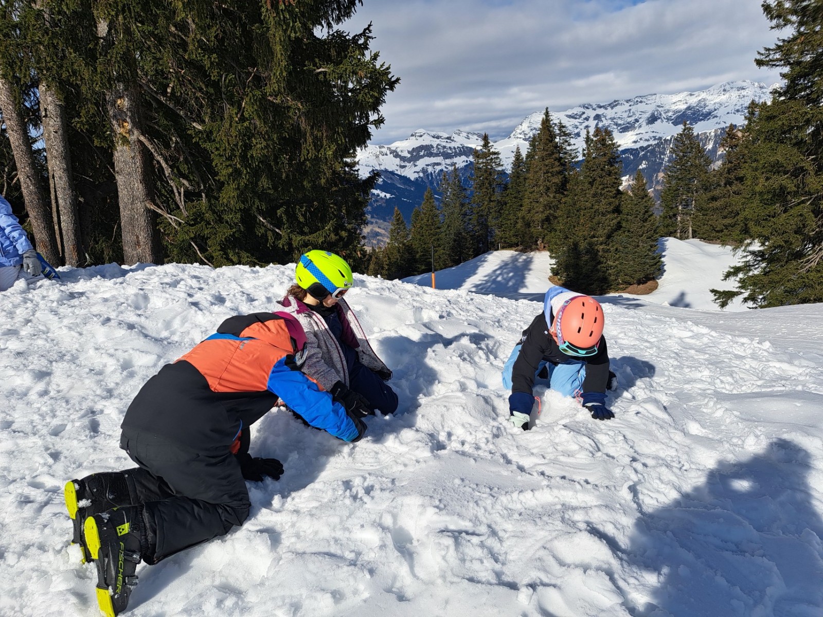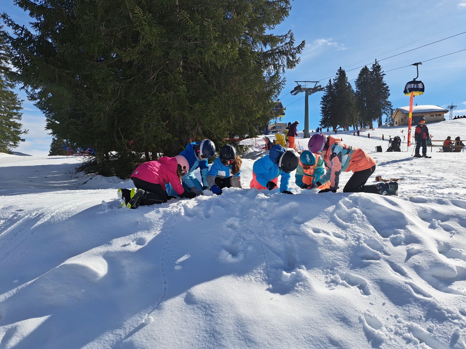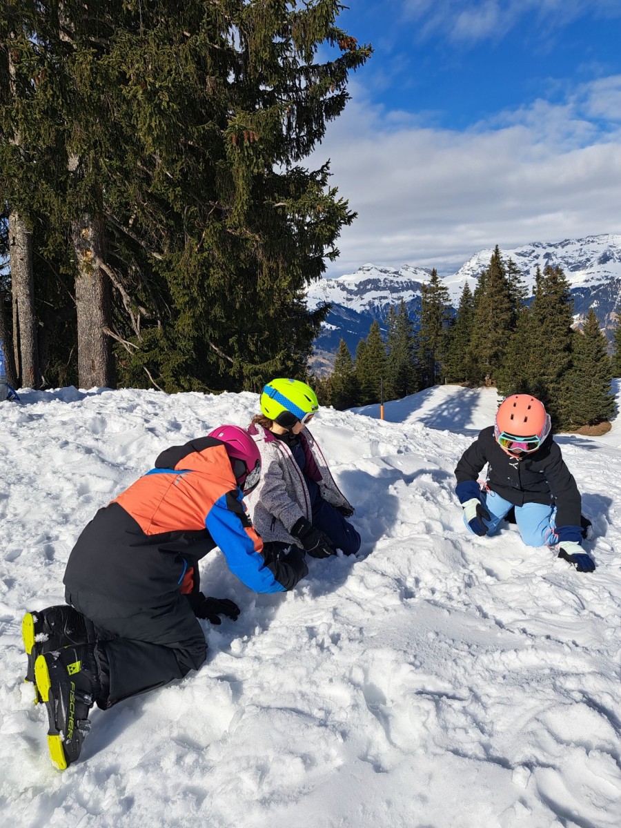 Heute Morgen standen wir auf und sind frühstücken gegangen. Zum Frühstück gab es wie immer das Gleiche und zwar Brot, Gipfeli, Nutella und noch vieles mehr. Um 9:10 Uhr mussten zwei Gruppen draussen bereit stehen und um 9:15 der Rest. Dann gingen alle Gruppen Ski und Snowboard fahren.