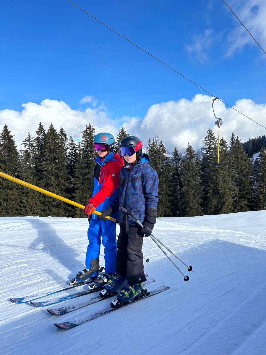 Die Leiter haben uns heute Morgen geweckt. Wir haben dann Zmorgen gegessen. Dann gingen wir hoch in die Berge mit der Gondel. Wir konnten schon viel besser Skifahren als gestern. Florians und seine Gruppe fuhren mit den Skis bis zur Mittelstation. Die Piste war sehr herausfordernd. Wir assen Zmittag in einem Restaurant. Das Essen war sehr lecker. Wir fuhren mit einer anderen Gruppe bis zur Mittelstation. Dann assen wir Znacht. Nach dem Essen spielten wir noch Tischtennis.